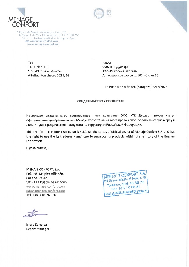 Компания DUSLAR – официальный дистрибьютор компании MENAGE CONFORT (МЕНАЖ КОНФОРТ) в России.