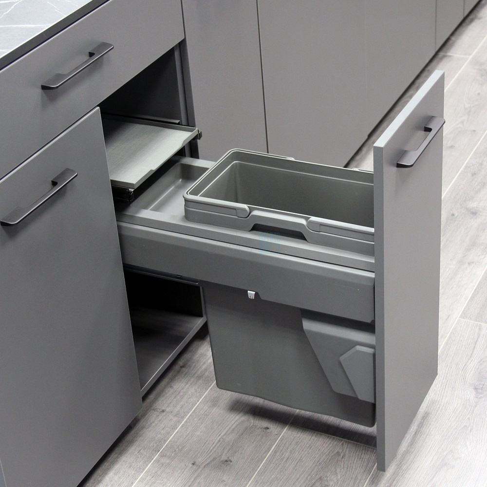 • Ведро выдвигается вместе с фасадом, полка-крышка может выдвигаться отдельно.