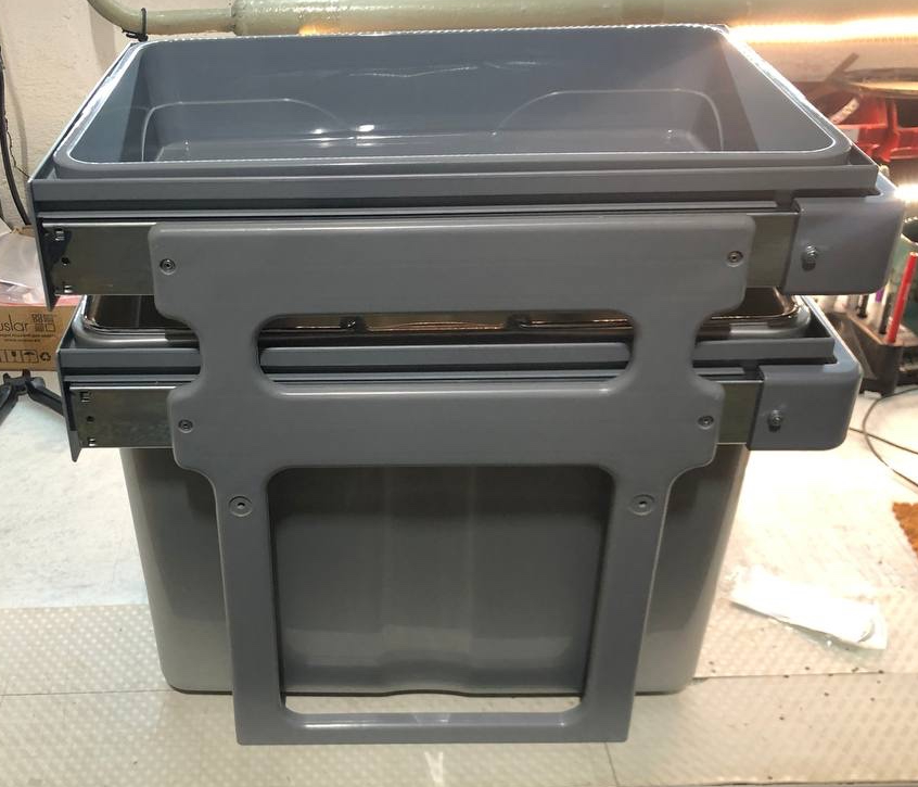 • Универсальная система для кухни включает в себя мусорное ведро и лоток для хранения хозяйственных и бытовых принадлежностей, что помогает поддерживать порядок и чистоту.