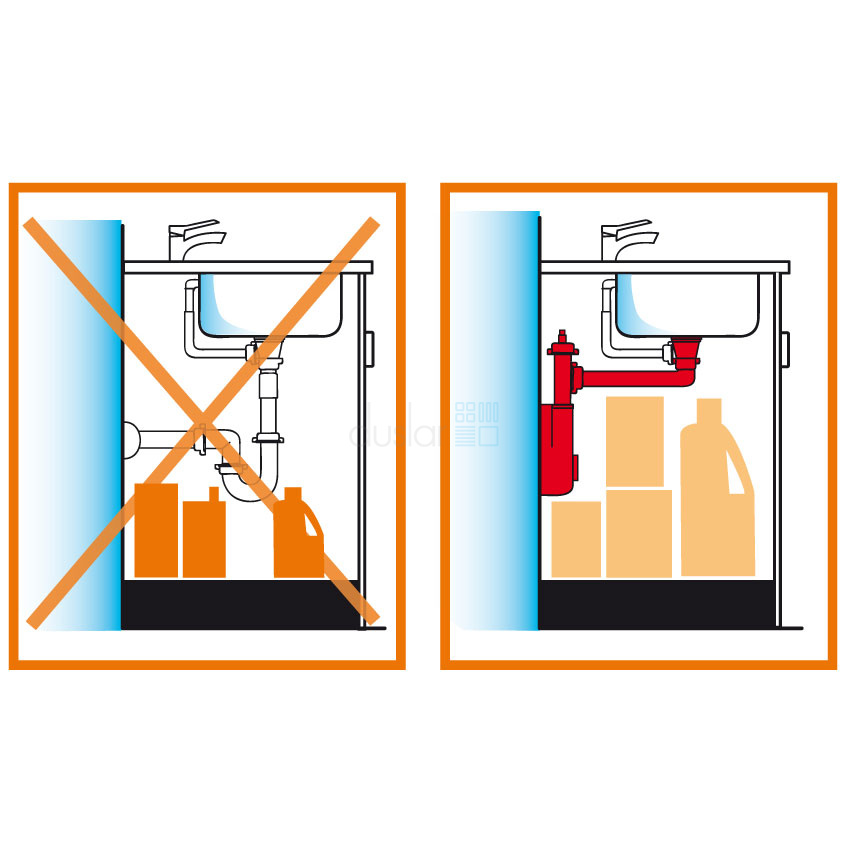 • Сифон Spazio позволяет оптимизировать пространство под мойкой и дает возможность установки встраиваемого мусорного ведра, системы сортировки или просто освободить место для хранения бытовых принадлежностей.