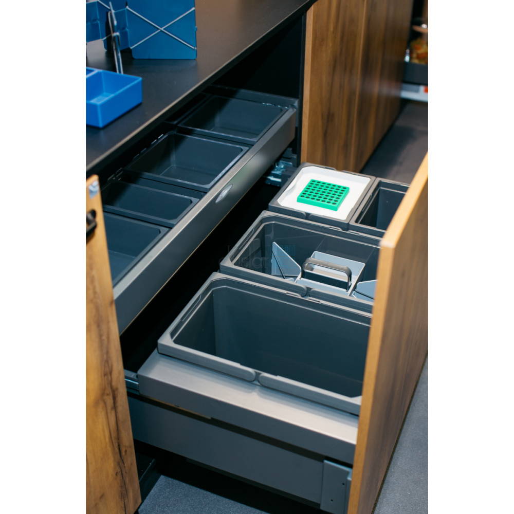 • Ведра выдвигаются вместе с фасадом, крышка остается внутри корпуса.