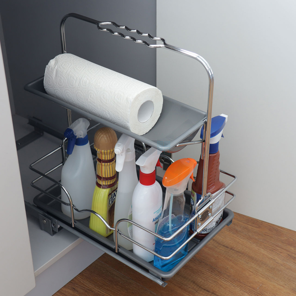 • Двухуровневая выдвижная система позволяет собрать чистящие средства в одном месте и содержать всё необходимое для уборки в порядке.