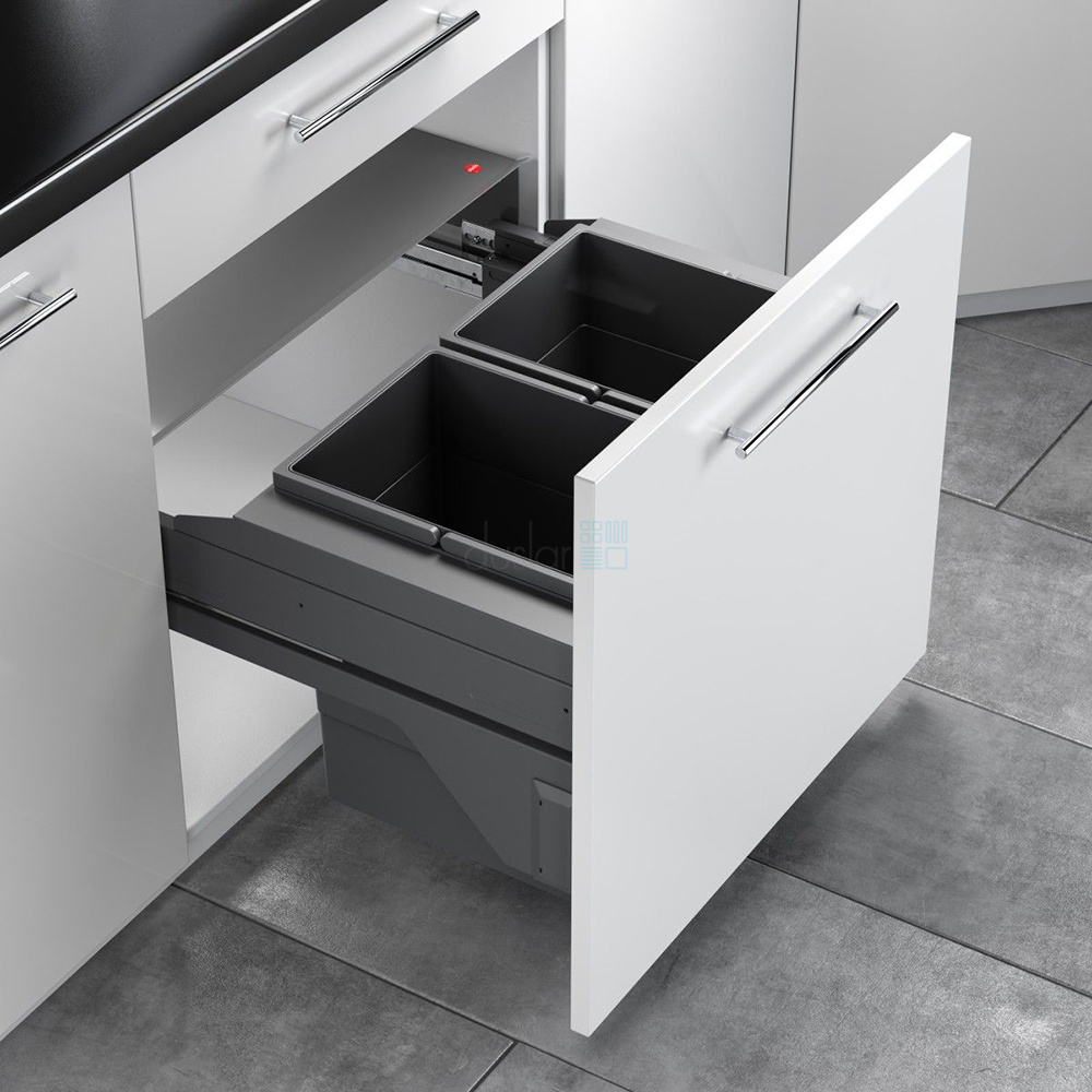 • Направляющие полного выдвижения позволяют полностью выдвинуть ведро, а доводчик обеспечивает плавное и мягкое закрытие.