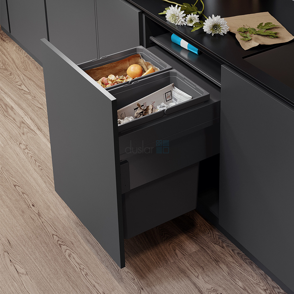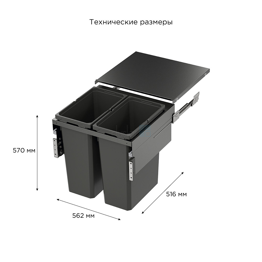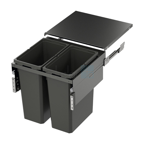 • Ведра выдвигаются вместе с фасадом, общая крышка остается внутри корпуса.