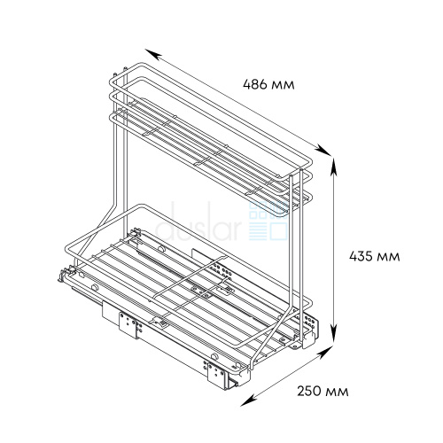 • Габариты изделия с учетом направляющих: ширина 250 мм, глубина 486 мм, высота 435 мм.