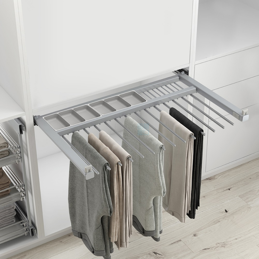 • Держатель для брюк полностью выдвигается из шкафа и обеспечивает удобный доступ к содержимому.