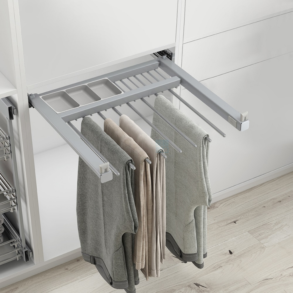 • Держатель для брюк полностью выдвигается из шкафа и обеспечивает удобный доступ к содержимому.