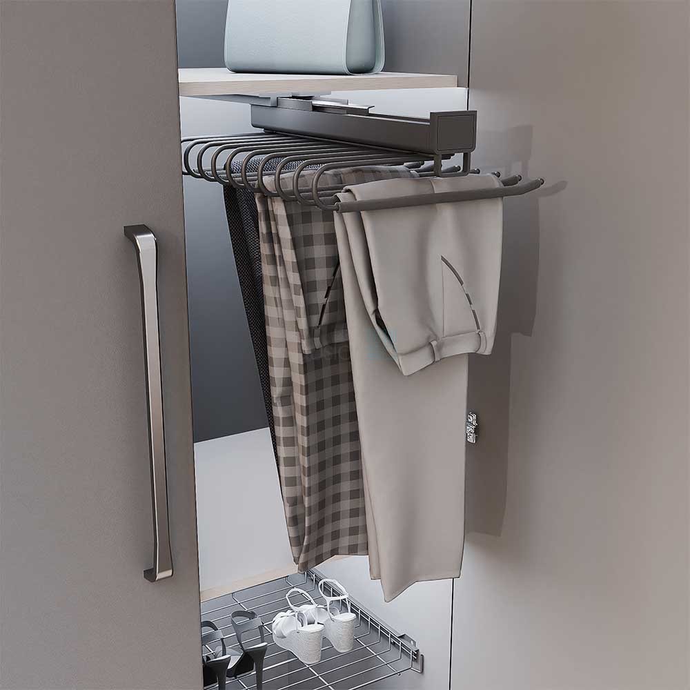 • Брючница полностью выдвигается из шкафа и обеспечивает удобный доступ к содержимому.