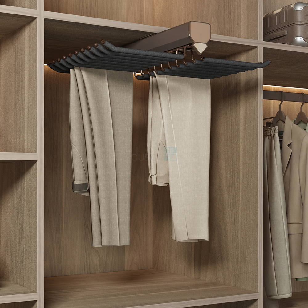• Брючница полностью выдвигается из шкафа и обеспечивает удобный доступ к содержимому.
