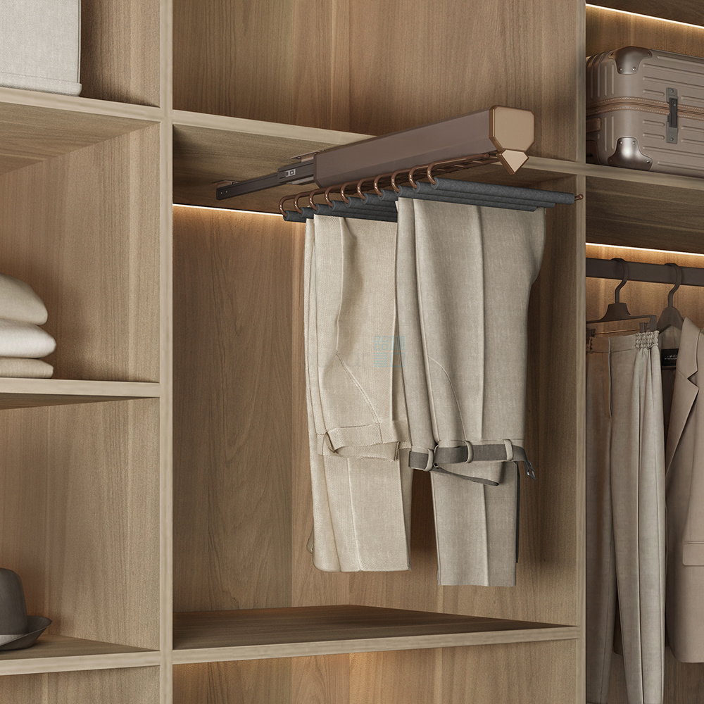 • Держатель для брюк полностью выдвигается из шкафа и обеспечивает удобный доступ к содержимому.