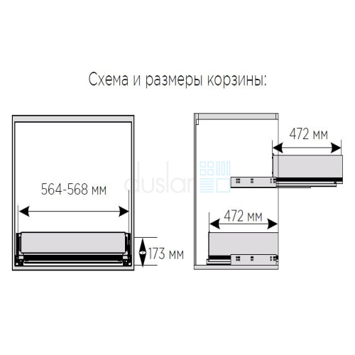 • Габариты корзины с направляющими: ширина 564-568 мм, глубина 472 мм, высота 173 мм.