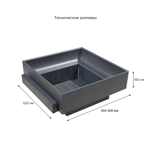 • Габариты ящика с направляющими: ширина 564-568 мм, глубина 520 мм, высота 150 мм.