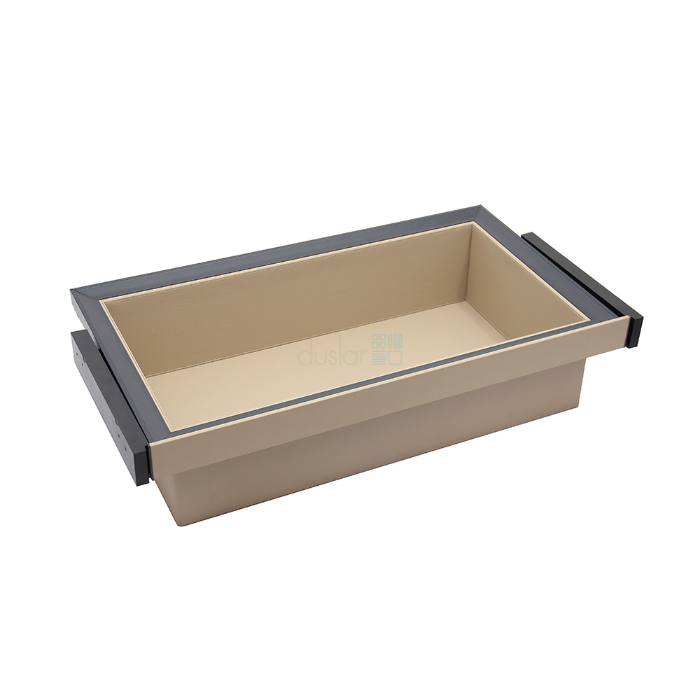 - Сочетание металлических элементов в цвете антрацит и бежевой отделки из экокожи придаёт выдвижному ящику премиальный внешний вид.