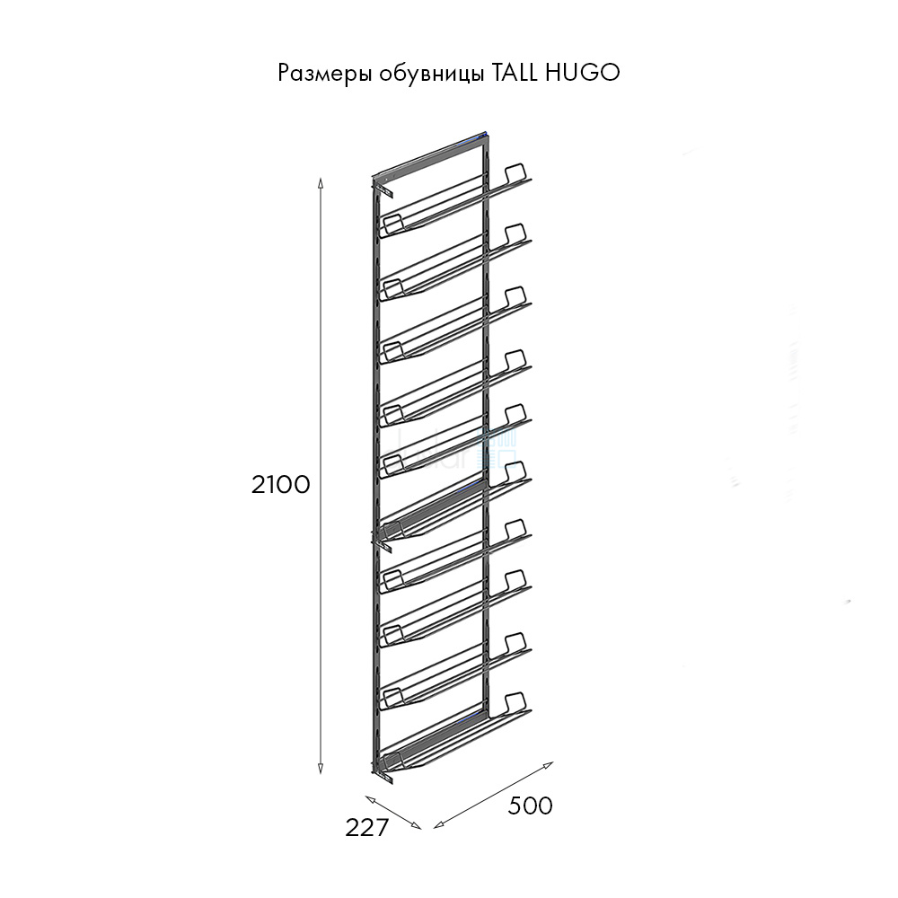 • Габариты обувницы с направляющими: ширина 227 мм, глубина 500 мм, высота 2100 мм.