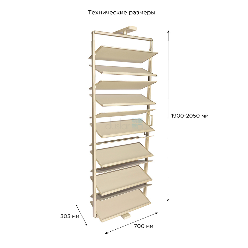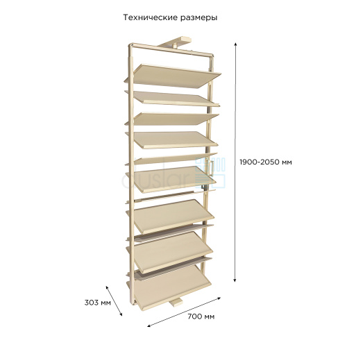 • Габариты системы с направляющими: ширина 700 мм, глубина 303 мм, высота 1900-2050 мм.