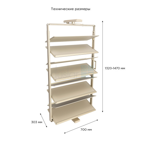 • Габариты системы с направляющими: ширина 700 мм, глубина 303 мм, высота 1320-1470 мм.