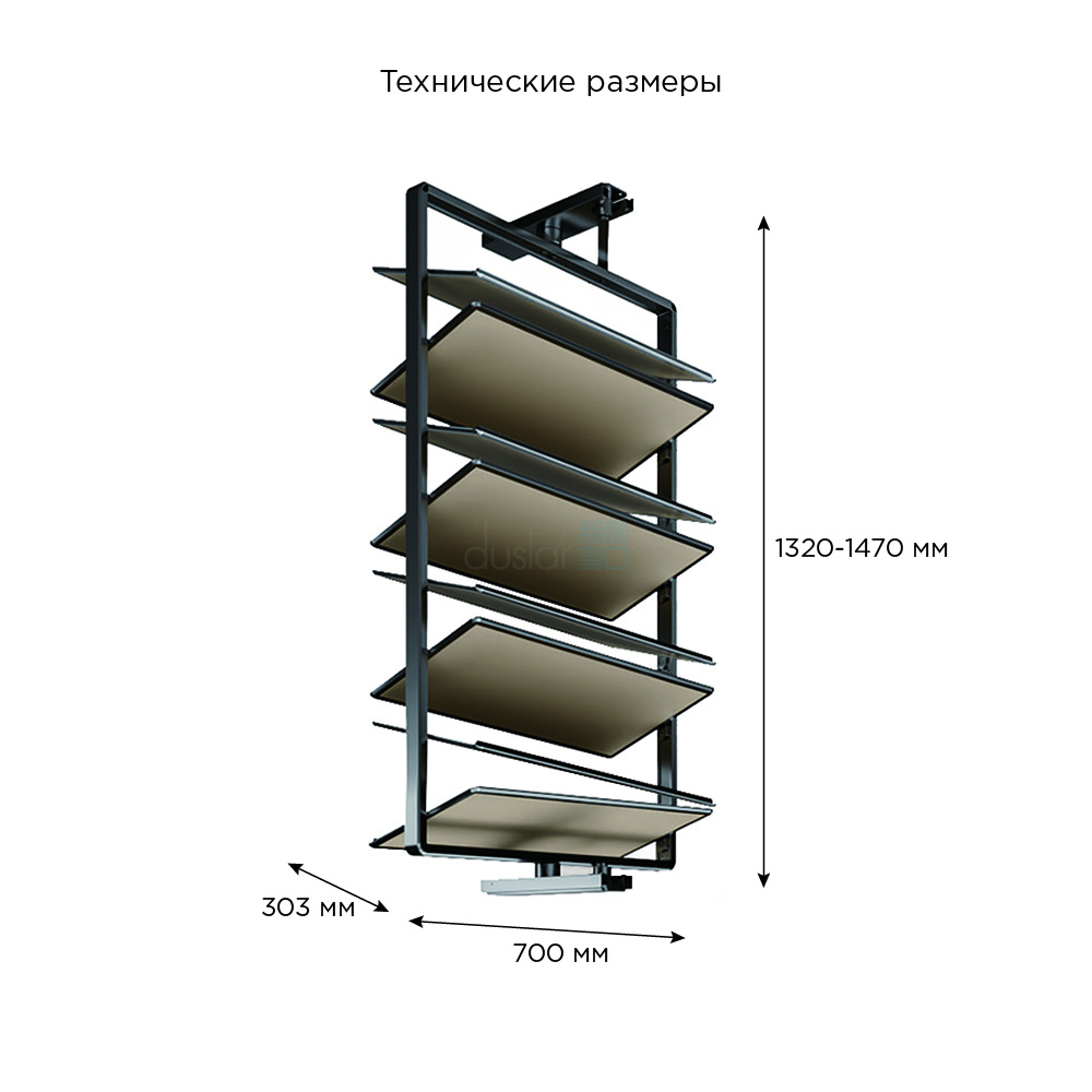 • Габариты системы с направляющими: ширина 700 мм, глубина 303 мм, высота 1320-1470 мм.