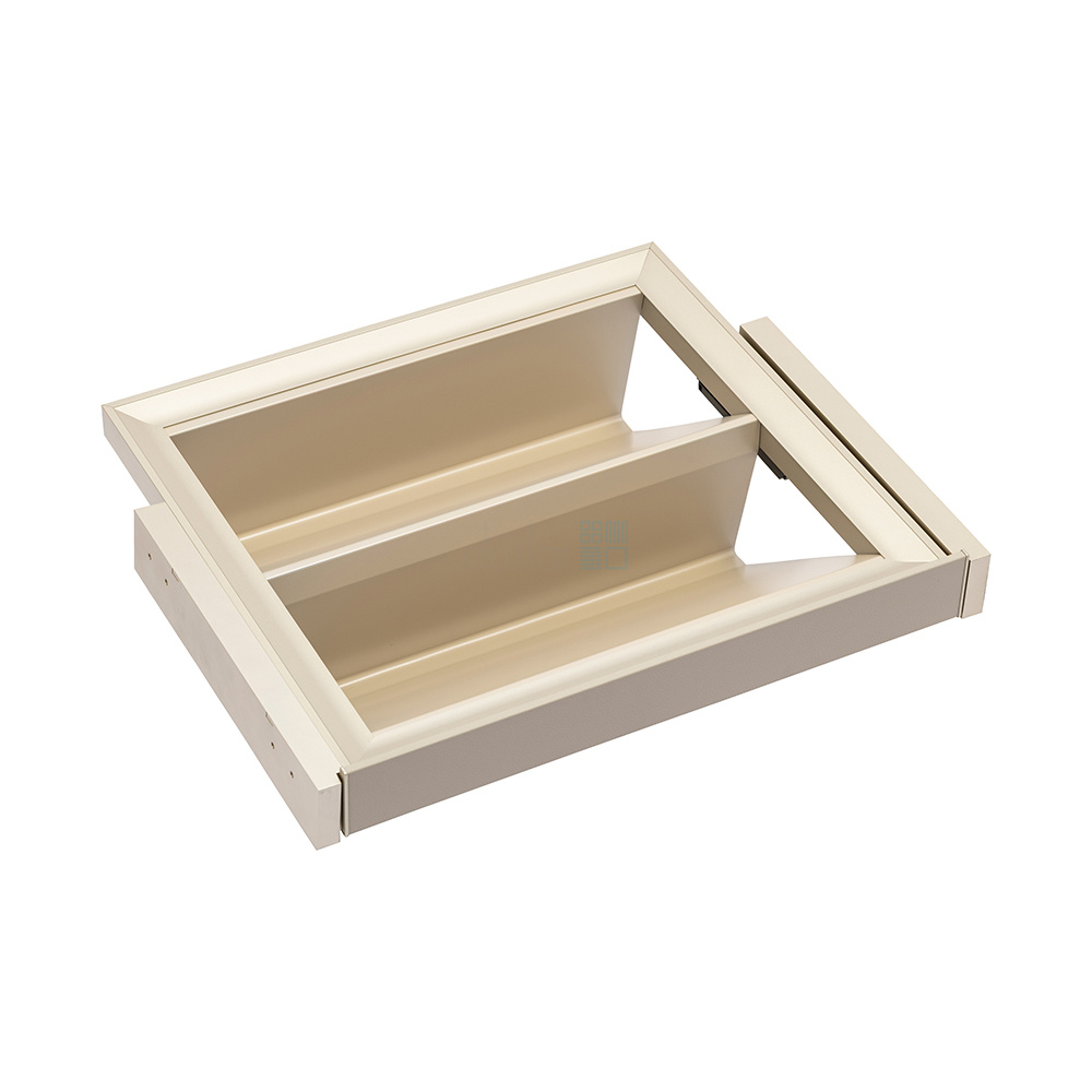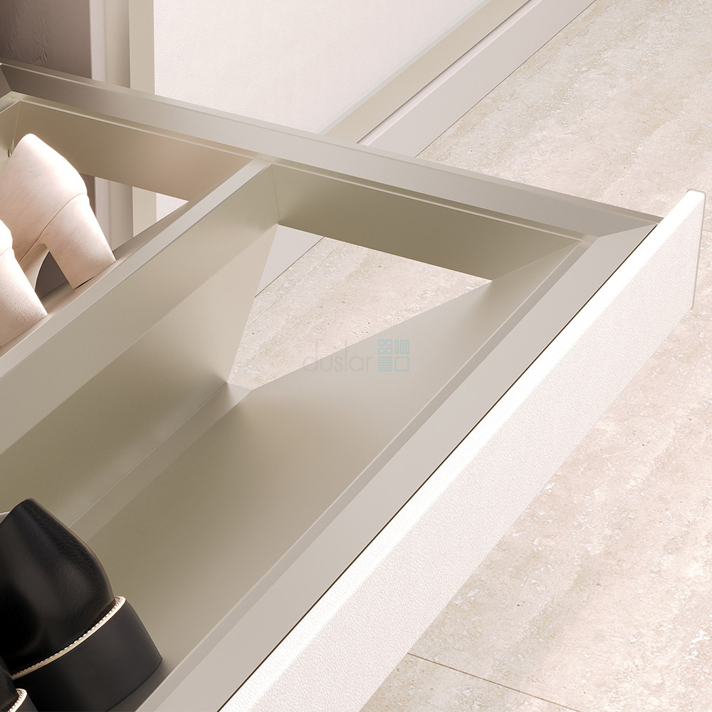 • Сочетание металлических элементов в цвете шампань и бежевой отделки из экокожи придаёт выдвижной обувнице премиальный внешний вид.
