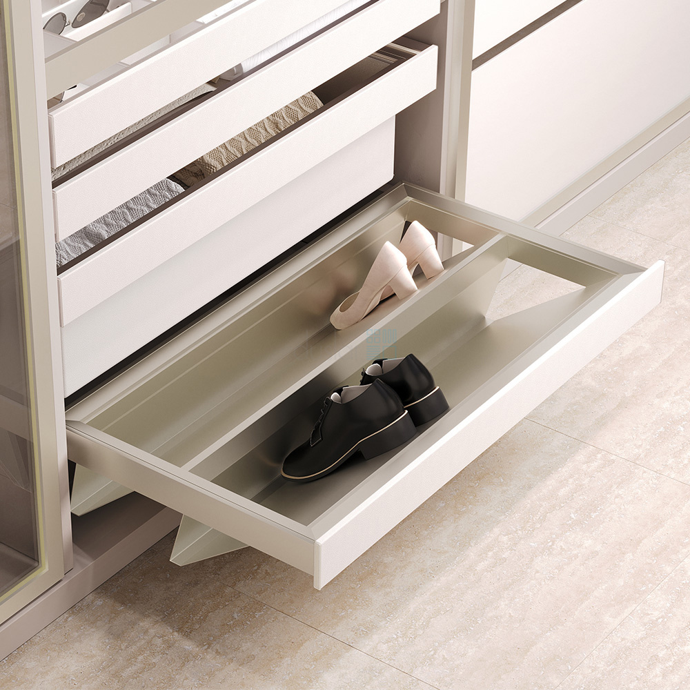 • Рекомендуем установить несколько выдвижных обувниц и ящиков из коллекции друг над другом для организации удобного хранения в шкафу или гардеробной.