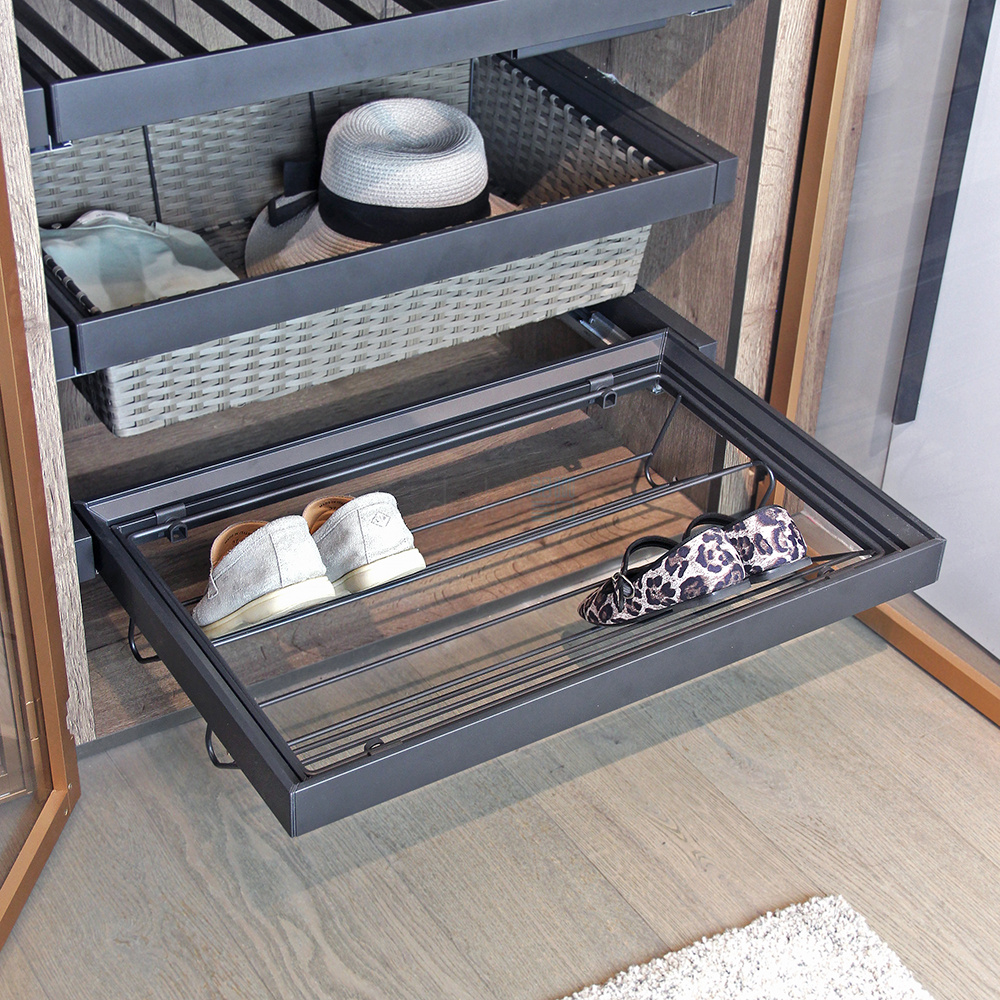 • Обувница полностью выдвигается из шкафа и обеспечивает удобный доступ к содержимому.