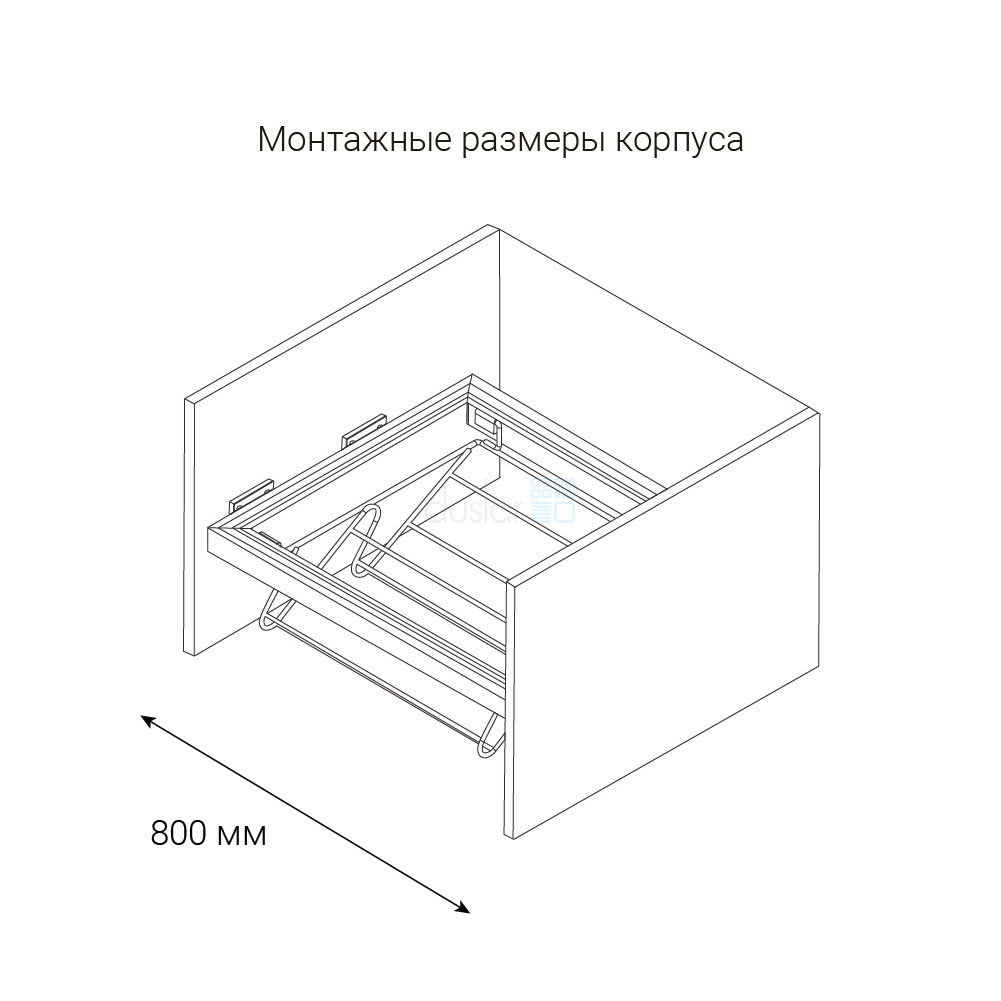 • Система подходит для установки в корпуса с распашными фасадами благодаря продуманному конструктиву – отступ от боковины корпуса до выдвижной части рамы 30 мм, что позволяет выдвигать держатель, не задевая петель.