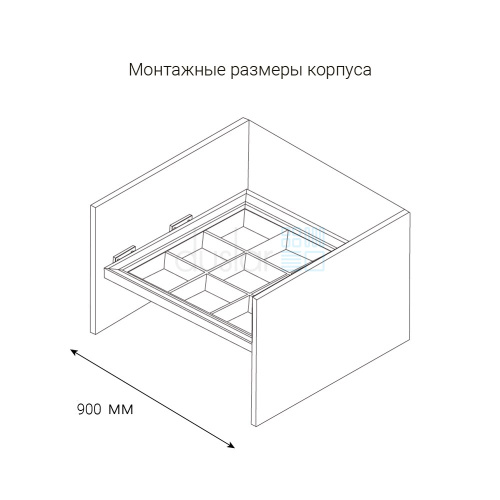 • Систему можно установить в корпуса с распашными фасадами благодаря продуманному конструктиву – отступ от боковины корпуса до выдвижной части рамы 30 мм, что позволяет выдвигать лоток-органайзер не задевая петель.