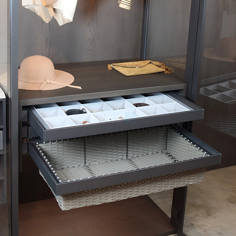 • Рекомендуем установить несколько выдвижных ящиков друг над другом для организации удобного хранения в шкафу или гардеробной.