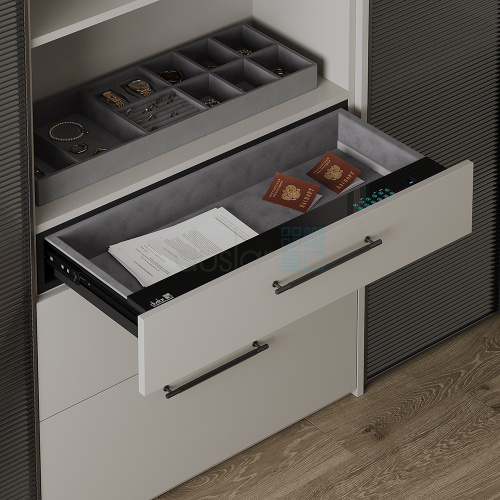• Благодаря возможности применения навесного фасада в едином стиле с остальной мебелью можно скрыть сейф, делая его похожим на стандартный выдвижной ящик.