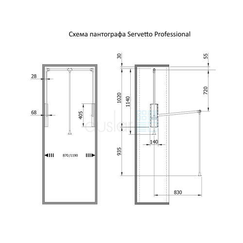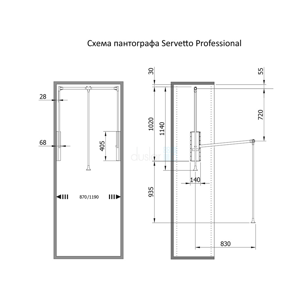 • Габариты пантографа с креплениями: ширина 870-1190 мм, глубина 140 мм, высота 1140 мм.