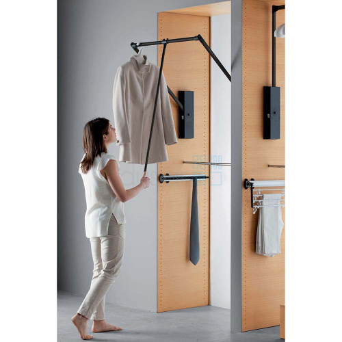 • С помощью пантографа можно разместить одежду на плечиках, что предотвратит ее сминание, обеспечит эстетичный вид и удобство в использовании.