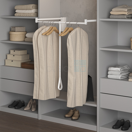 • Помогает эффективно организовать верхнее пространство шкафа гардеробной комнаты для хранения одежды на вешалках и обеспечивает максимальную доступность к вещам.