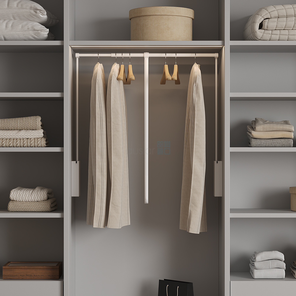 • Помогает эффективно организовать верхнее пространство шкафа гардеробной комнаты для хранения одежды на вешалках и обеспечивает максимальную доступность к вещам.