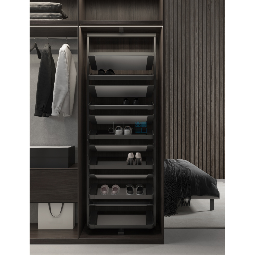 • Уникальная система для хранения обуви: при выдвижении поворачивается и обеспечивает удобный доступ к каждой паре обуви.