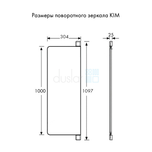 • Габариты зеркала с креплением: ширина 304 мм, глубина 25 мм, высота 1097 мм (высота зеркала без крепления – 1004 мм).