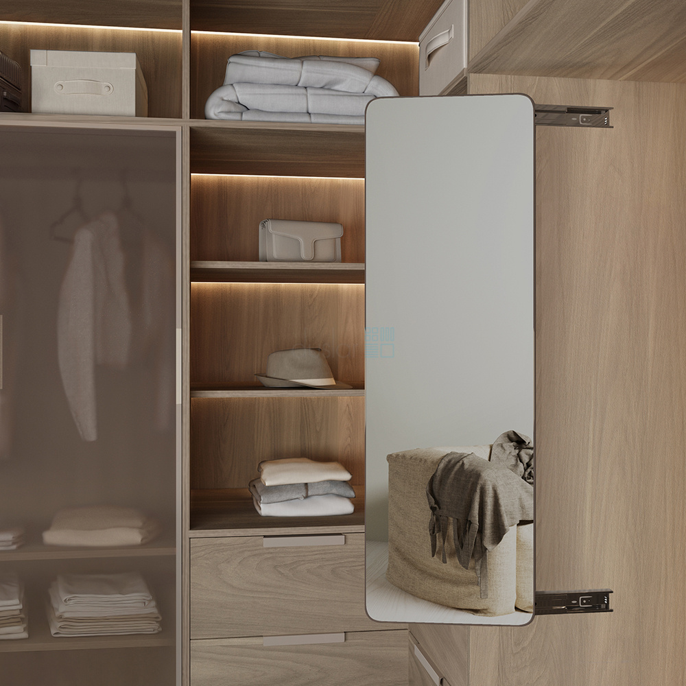 • Выдвижное поворотное зеркало – это идеальный вариант размещения зеркала в домах с маленькими детьми или в интерьерах, где установка зеркал на фасадах шкафов не подходит по дизайну.