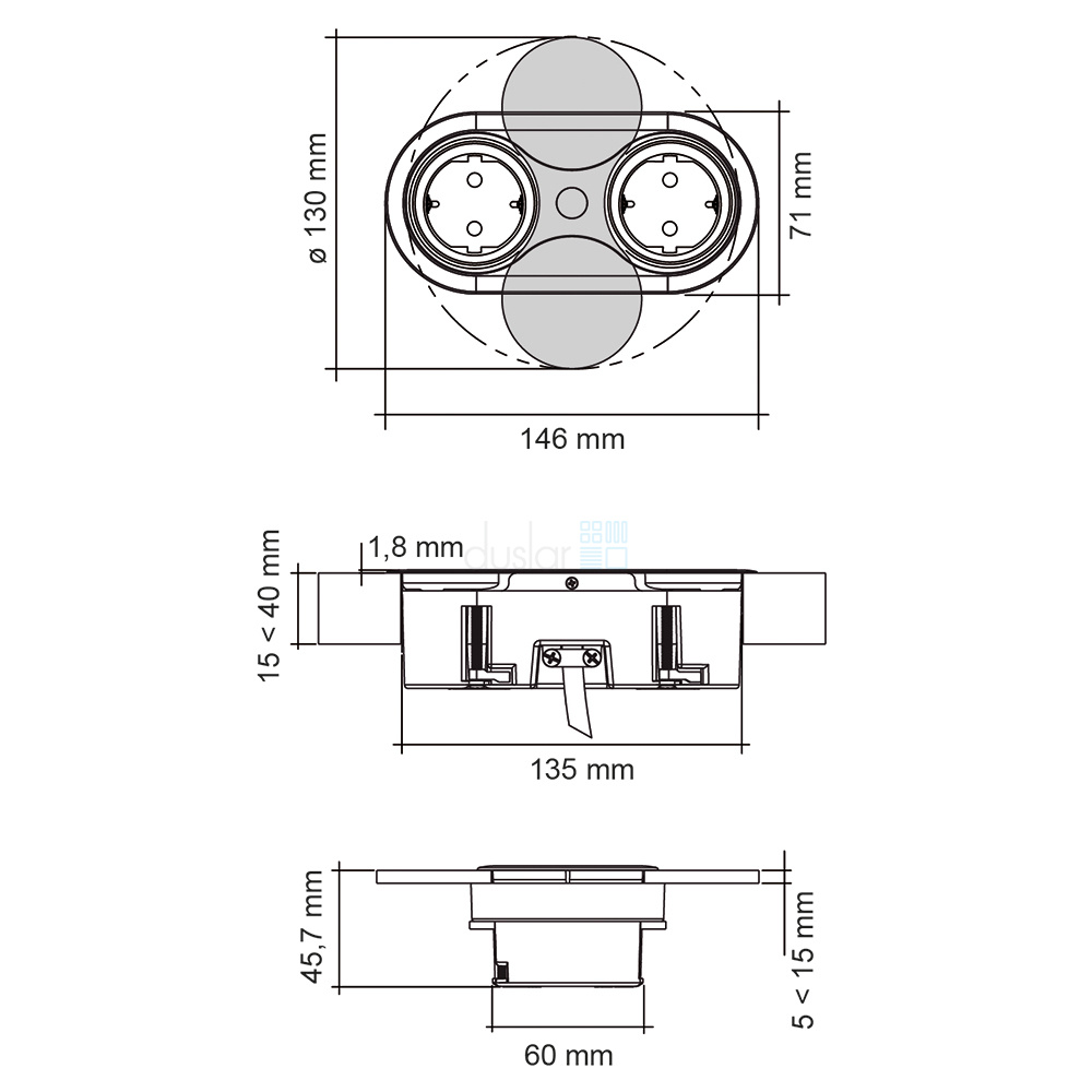 - Благодаря своим размерам розетка может устанавливаться практически на любой поверхности с толщиной от 15 мм до 40 мм.