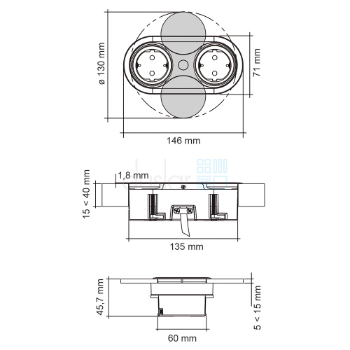 - Габариты розетки: длина 146 мм, ширина 71 мм, высота 45,7 мм.