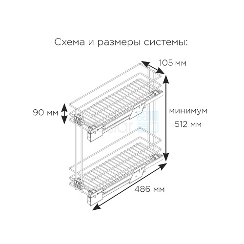 • Габариты системы с учетом направляющих: ширина 105 мм, глубина 486 мм, высота 512 мм.