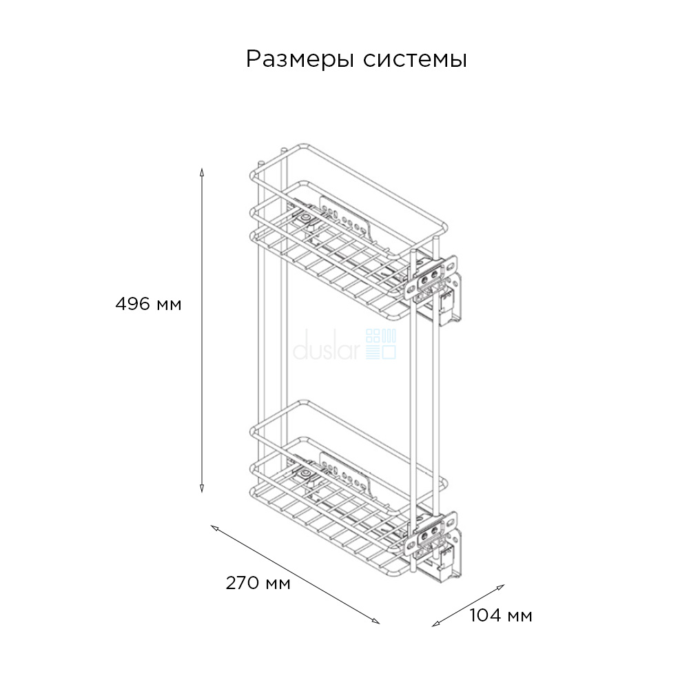 • Габариты бутылочницы с учетом направляющих: ширина 104 мм, глубина 270 мм, высота 496 мм.