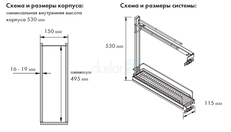 • Габариты изделия с направляющими: ширина 112 мм, глубина 492 мм, высота 525 мм.