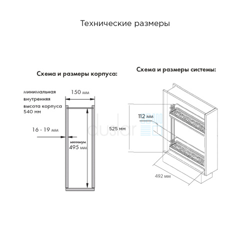 • Габариты изделия с направляющими: ширина 112 мм, глубина 492 мм, высота 525 мм.