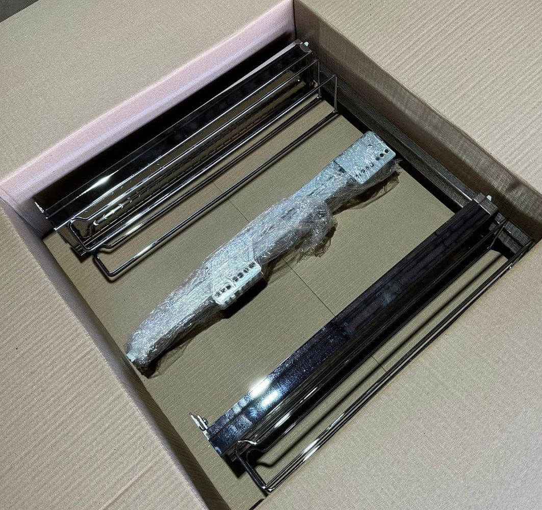 Комплектация: универсальная рама с 2 полками, направляющие полного выдвижения Grass, 2 доводчика плавного закрывания, фасадное крепление.