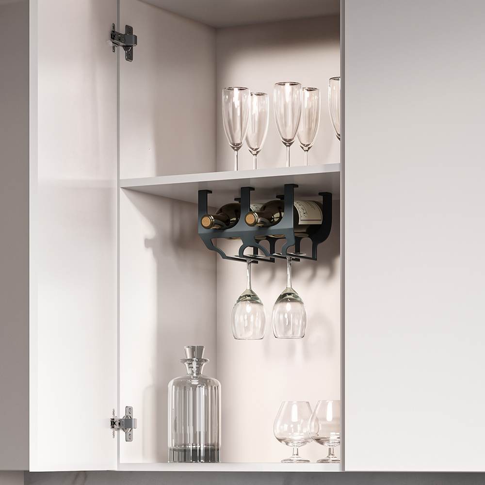 • Держатель для бокалов позволяет эффективно оптимизировать пространство, так как может использоваться в качестве дополнительной полки внутри шкафа.