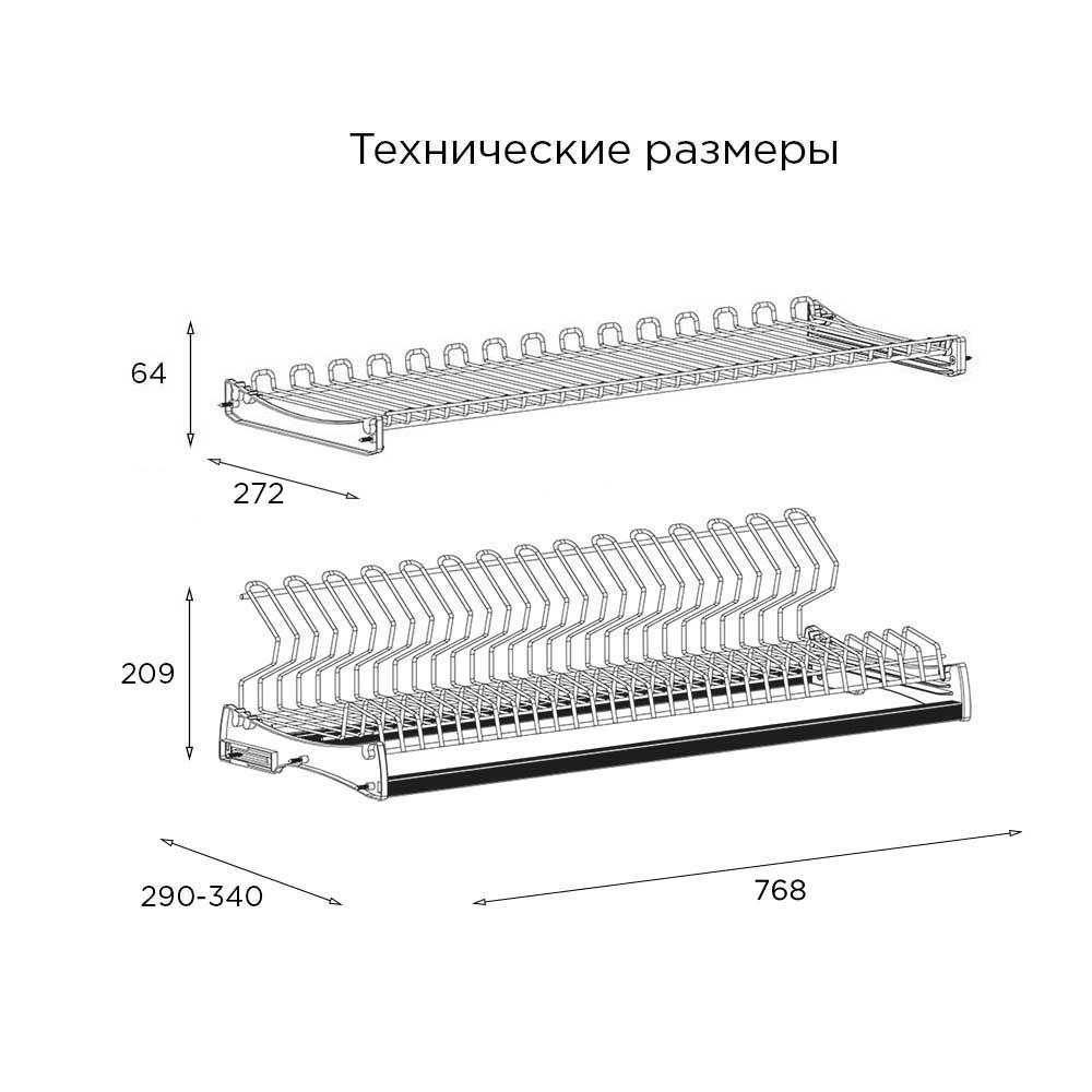• Габариты яруса для тарелок с учетом крепежа: ширина 768 мм, глубина 290-340 мм, высота 209 мм.