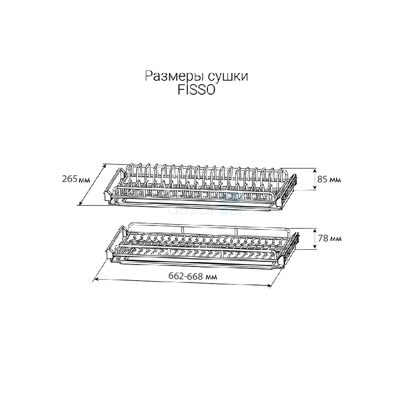 • Габариты яруса для тарелок с учетом крепежа: ширина 662-668 мм, глубина 265 мм, высота 85 мм.