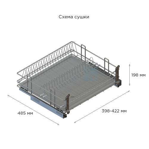 • Габариты сушки с направляющими: ширина 398-422 мм, глубина 485 мм, высота 198 мм.