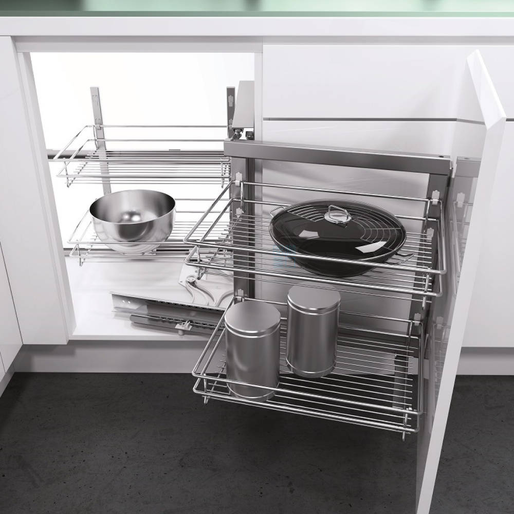 • Легко доставать предметы, которые хранятся в самых труднодоступных местах углового шкафа, за счет выдвижения корзин из угла шкафа.