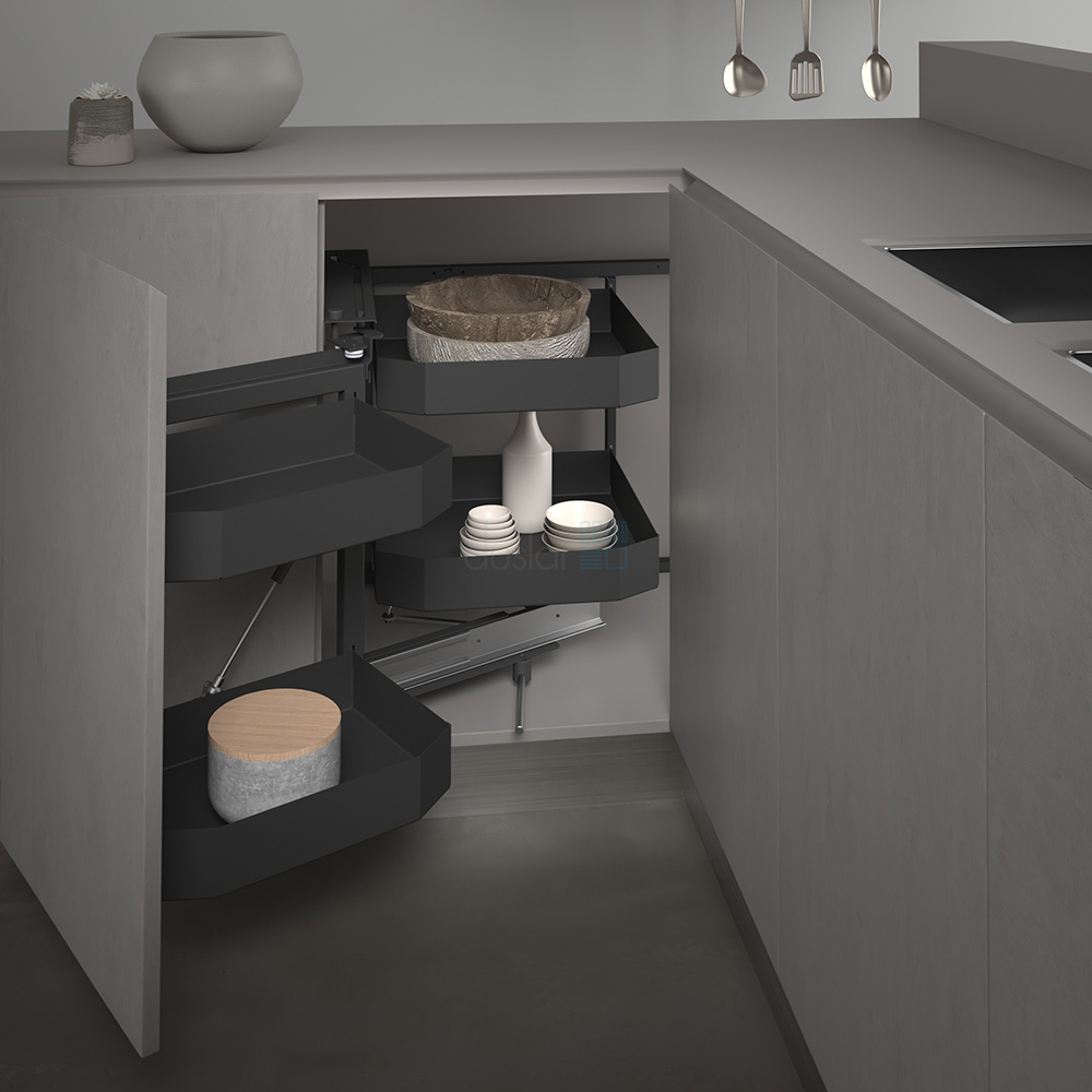 • Волшебный угол позволяет легко доставать предметы, которые хранятся в самых труднодоступных местах углового шкафа, за счет выдвижения корзин.