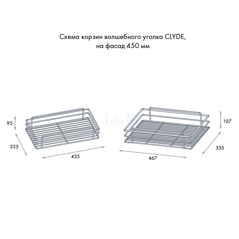 • Габариты внешних корзин: ширина 435 мм, глубина 225 мм, высота 95 мм.
