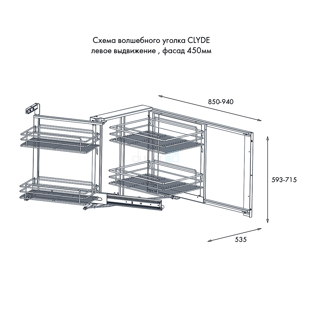 • Габариты системы с учетом направляющих: ширина 850-940 мм, глубина 535 мм, высота 593-715 мм.